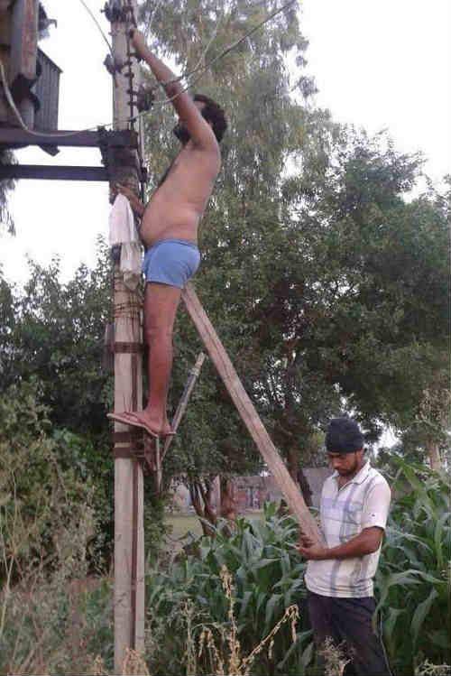 Foto di bawah ini tampak seseorang sedang membetulkan panel listrik. Tetapi karena tidak ada tangga, maka sang empunya nekat menaiki panel tersebut dan meminta temannnya untuk menopang badannnya dengan kayu agar tidak terjatuh.