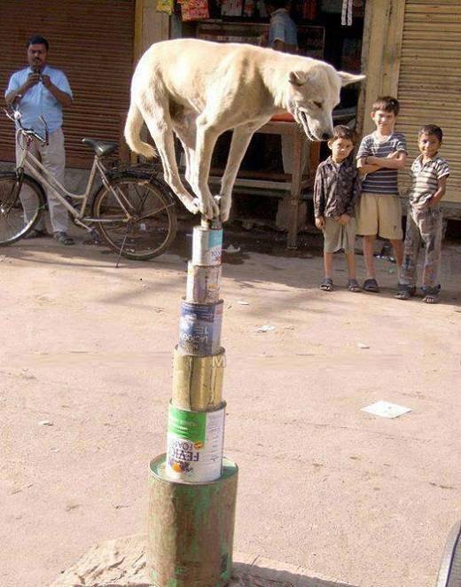 Entah siapa yang menyusun kaleng-kaleng itu. Namun tampak di foto seekor anjing tengah menaiki tumpukkan kaleng tersebut. Nampak seperti seekor anjing sedang melakukan atraksi yang begitu mengagumkan.